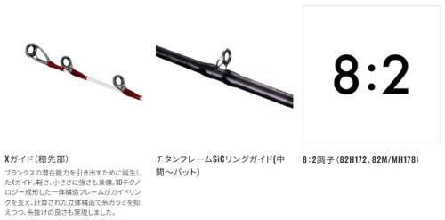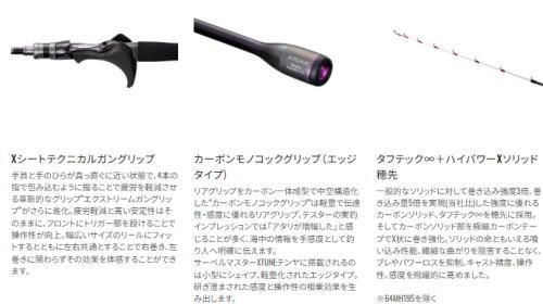 スパイラルXコアやハイパワーXといった基本的な構造設計は上位機種であるLIMITEDから引継ぎ、シャープな操作性は堅持。また、糸ガラミの発生しやすい穂先部には軽量でトラブルレスなXガイドを搭載し、タチウオとの真っ向勝負をサポート。そして情報の発信源たる穂先にはアイテムの特性に応じて適切な素材を採用。そして穂先が捉えた振動はグリップエンドに採用したカーボンモノコックグリップが逃すことなくアングラーに伝達する。タックルと釣り人の接点となるリールシートには、ロッド性能を飛躍的に高めるXシートテクニカルガングリップを搭載。繊細なロッド操作を実現するフロントトリガーと、高いパーミング性能を発揮するガングリップ形状により、軽快かつ繊細な誘いの操作性とファイト時の安定感が向上。