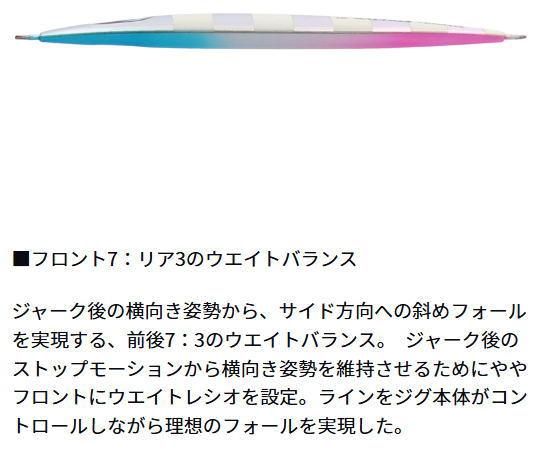ジャーク後の横向き姿勢から、サイド方向への斜めフォールを実現する、前後7:3のウエイトバランス。 ジャーク後のストップモーションから横向き姿勢を維持させるためにややフロントにウエイトレシオを設定。ラインをジグ本体がコントロールしながら理想のフォールを実現した。