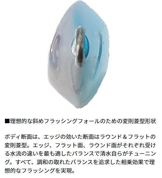 ジャーク後の横向き姿勢から、サイド方向への斜めフォールを実現する、前後7:3のウエイトバランス。 ジャーク後のストップモーションから横向き姿勢を維持させるためにややフロントにウエイトレシオを設定。ラインをジグ本体がコントロールしながら理想のフォールを実現した。