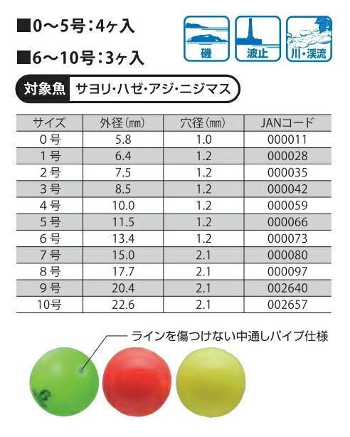 ラインを傷つけない中通しパイプ仕様。中空なので浮力が有ります。誘導しかけのウキ止めとして、アタリウキとして、チモトにつけて仕掛けを浮かせたり、大きいところはクラゲ防止や、ゴミ取りにと使い道はいろいろです。