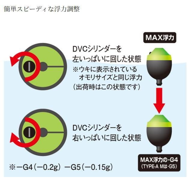 ウキのトップ部に設置されたDVCシリンダーを回し、上下させ、本体に設けた気室の大きさを変化させることで浮力を無段階に調整。DVCシリンダーが一番上にある状態ではウキの浮力表示どおりの号数に、一番下まで締め込むと表示号数から−G4(TYPE-AMは−G5)の設定まで浮力を落とすことができる。DVCは、通常であればG4〜G8といった極小のオモリを打ってウキの沈降速度を調整するところを、DVCドライバーひとつでスピーディに、かつ無段階に微調整できる画期的システムである。
