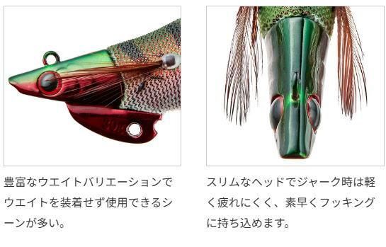 また、着底後の姿勢はヘッドのみを海底に付けた状態でしり上がりの姿勢をキープできるため、根掛かりの頻度減少にも効果的。薄型のヘッド形状はしっかりとしたダートアクションを生み出し広い範囲でイカを誘い、水平姿勢を維持した「ステイ」でイカの抱きやすい姿勢を生み出す。