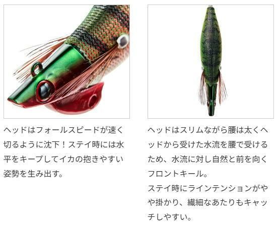 シャープなヘッド形状でボトムまで素早く沈む。沈下姿勢はタテに素早く沈むため、着底の判別がしやすい。イカはエギが沈んでいく時に既に反応を示していることが多く、着底後に素早く誘いを入れられる。