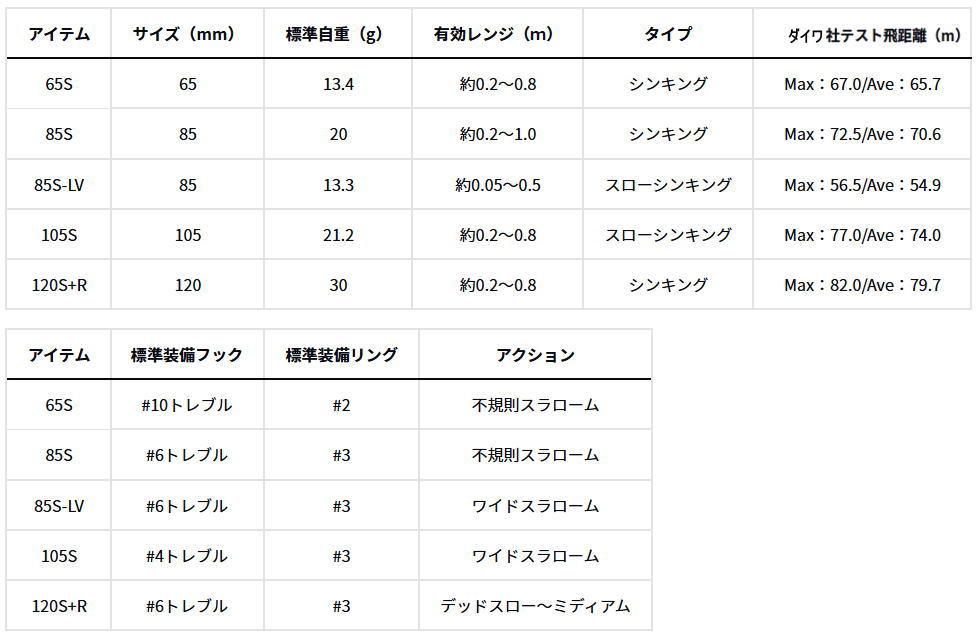 河川やサーフ・磯・干潟などのシャローエリアや水面直下を簡単に攻略できるデイ&ナイト対応シンキング&スイミングペンシル。ジグ並みに飛距離が出るので、ミノーでは届かない遠くのボイルも射程範囲に収める。コノシロ・落ち鮎・イワシ・イナッコ・ハタハタ等様々なパターンに対応。アクションは流れに敏感かつ不規則なスラロームアクション。