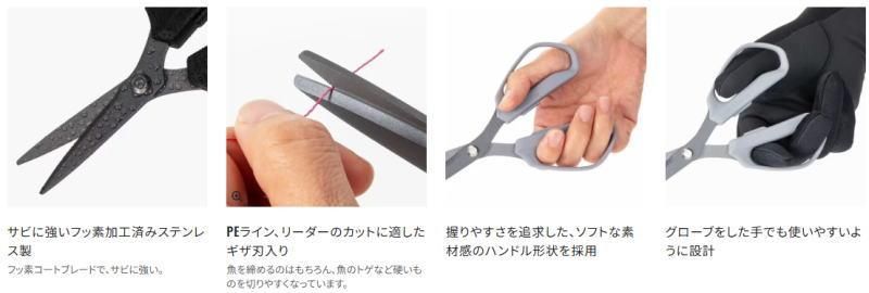 PEラインから魚捌き、トゲ切りまで使える刃物職人こだわりの万能バサミ。手袋をしたままでも使いやすいハンドルを採用。