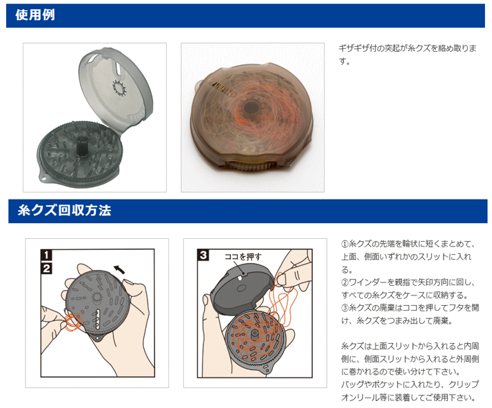 スリットから糸クズを入れて、ワインダーを矢印方向に回すだけ!