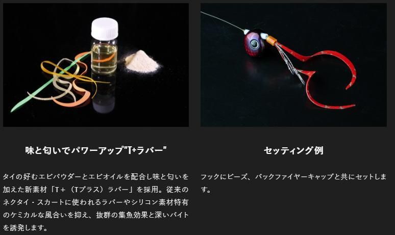 タイの好むエビパウダーとエビオイルを配合し味と匂いを加えた新素材「T+(Tプラス)ラバー」を採用。従来のネクタイ・スカートに使われるラバーやシリコン素材特有のケミカルな風合いを抑え、抜群の集魚効果と深いバイトを誘発します。