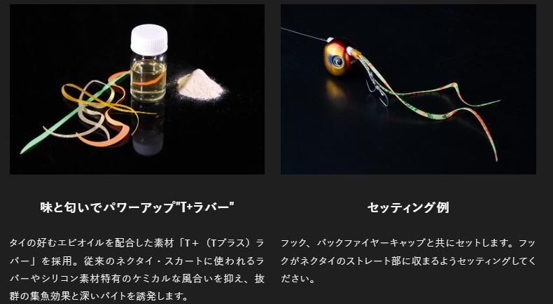 タイの好むエビオイルを配合した素材「T+(Tプラス)ラバー」を採用。従来のネクタイ・スカートに使われるラバーやシリコン素材特有のケミカルな風合いを抑え、抜群の集魚効果と深いバイトを誘発します。