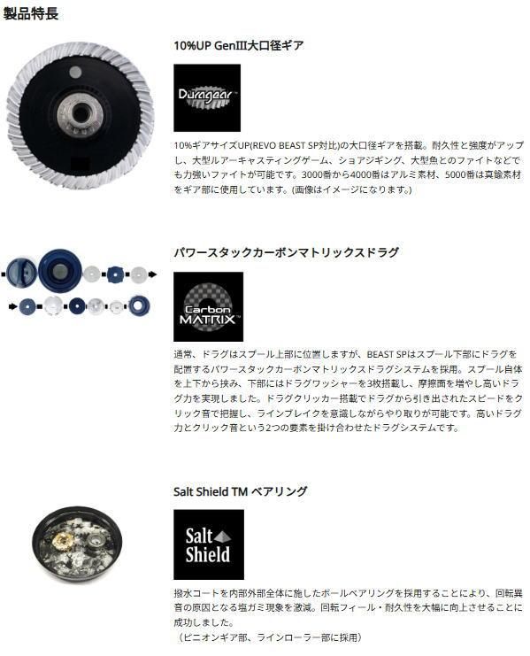 10%ギアサイズUP大口径ギア搭載(REVO BEAST SP対比)、パワースタックカーボンマトリックスドラグ搭載で高いドラグ力を実現。大型ルアーキャスティングゲームや、大型魚とのファイトに特化した機能を搭載し、ハイパフォーマンスを実現するBEAST SP